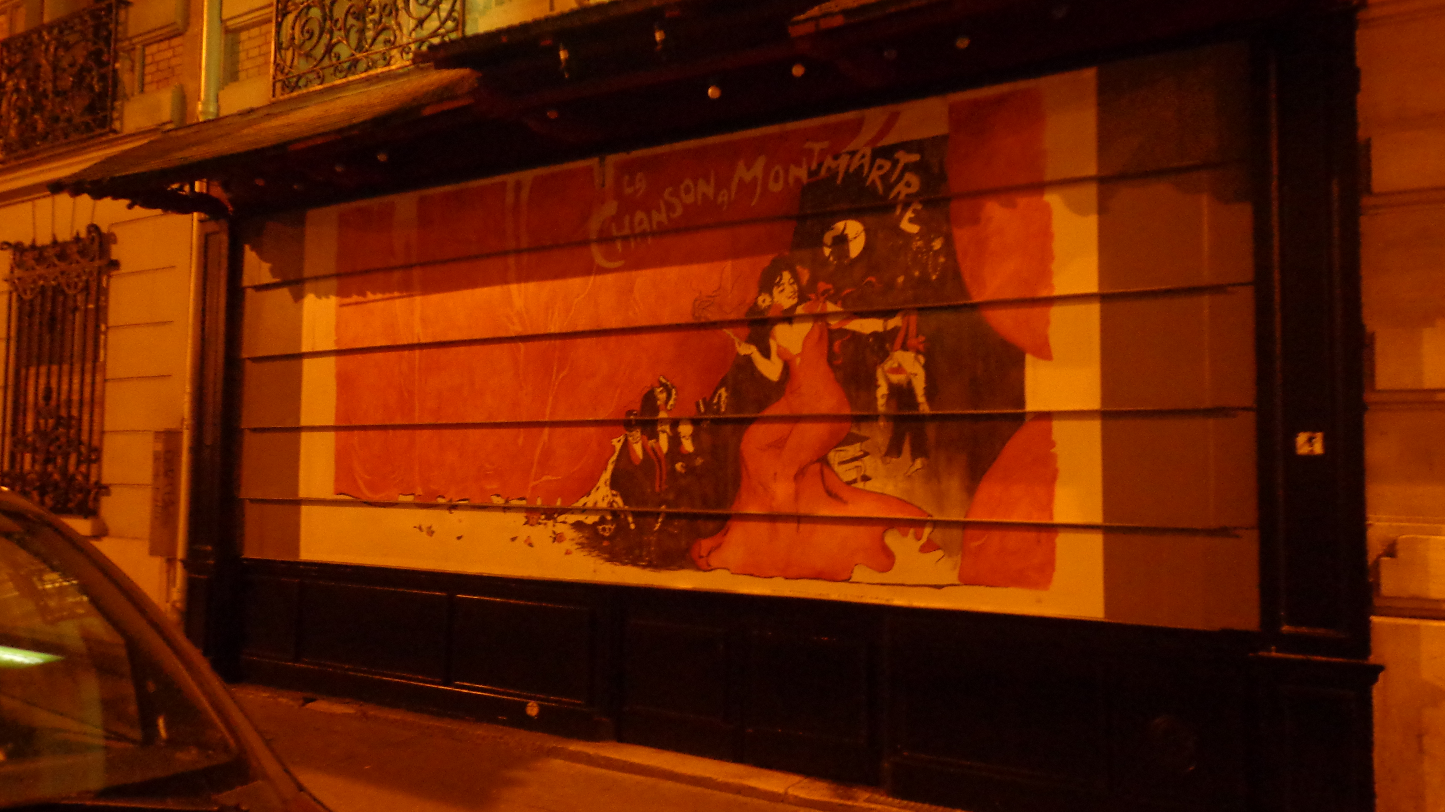 Negozi chiusi. Lampioni bassi. E ogni saracinesca è un quadro, un antico affiche di un cinema o di un teatro d’avanspettacolo. Dal Moulin de la Galette alla Cigale, dal Trianon a un gioioso Moulin Rouge. Di serrata in serrata, tutta la storia del varietà parigino, che adesso ancora continua pochi metri più in là sul Boulevard de Clichy, mi scorre davanti, passo dopo passo. Un can can silenzioso prende vita ogni sera. Non appena i negozi abbassano le saracinesche, le cosce tornano ad alzarsi, in questa pinacoteca a cielo aperto della Parigi di una volta, che sembra quasi profumare ancora di cipria.