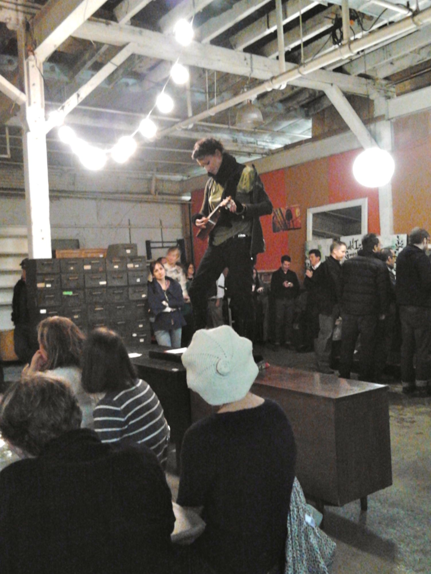 A child’s dream came true last night. Amanda Palmer – whose songs I used to listen to in my small bedroom when I was sixteen – in a solo performance with her “small and forceful” ukulele at the New Gowanus Space in Brooklyn for the Winter Festival, among old furniture, New Orleans food and apple and cinnamon pie.